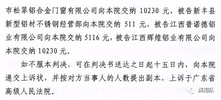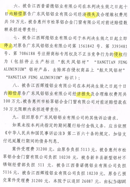 连云港凤铝系列维权案:诉辉煌公司等四被告,法院判赔250余万